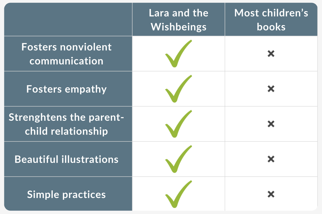 Lara and the Wishbeings, a beautifully illustrated storybook that makes learning nonviolent communication for kids a fun and engaging experience. Perfect for conscious parenting, this book helps children ages 4-8 name their feelings, understand needs and listen to their intuition. Ideal for young learners in preschool, kindergarten and beyond.